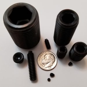 Socket set screws have the same purpose as a slotted set screw but can apply more torque when tightening. They are typically made from alloy steel per ASTM F912 the part is through hardened opposed to the case hardening on slotted set screws. They also come in stainless steel, brass, bronze and many other materials depending on the end use. Common point styles are:
